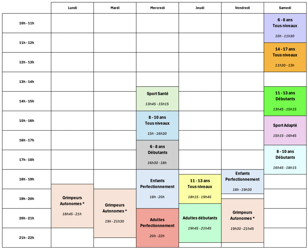 * Les horaires des grimpeurs autonomes peuvent varier.